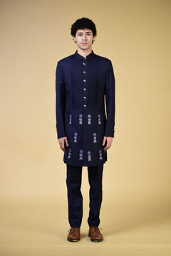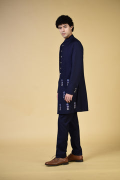 Enhance your wardrobe with the Cobalt Blue Serenade Indo Set. This navy blue indo features elegant pleating on the top and a unique motif on the bottom, creating a sophisticated look. Paired with ivory pants, this set exudes style and luxury.