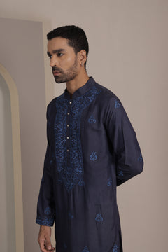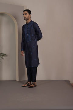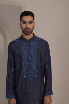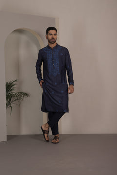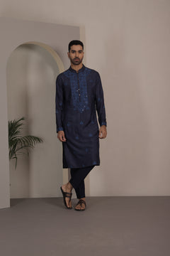 Introducing the Cobalt Dream Kurta Set, expertly crafted in silk and adorned with self embroidery and subtle touches of mirror embroidery. This set is perfect for adding a pop of bold color to your wardrobe, with a comfortable and stylish matching pants in the same stunning cobalt blue hue. Elevate your look and make a statement with this luxurious kurta set.