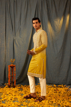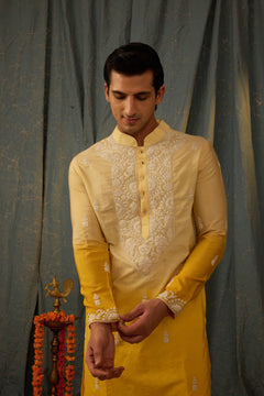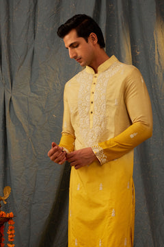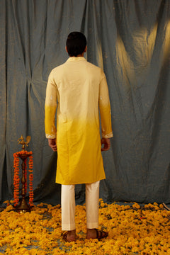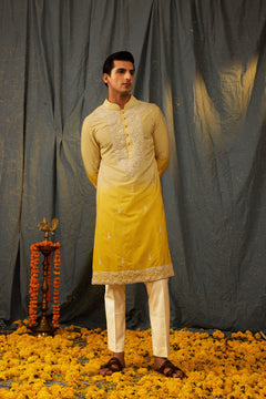 Experience effortless elegance with our Citrine Fusion Kurta Set. The ombre kurta transitions from lemon to yellow, complemented by delicate white dori embroidery. Complete the look with ivory pants. Elevate your wardrobe with this stunning fusion piece.
