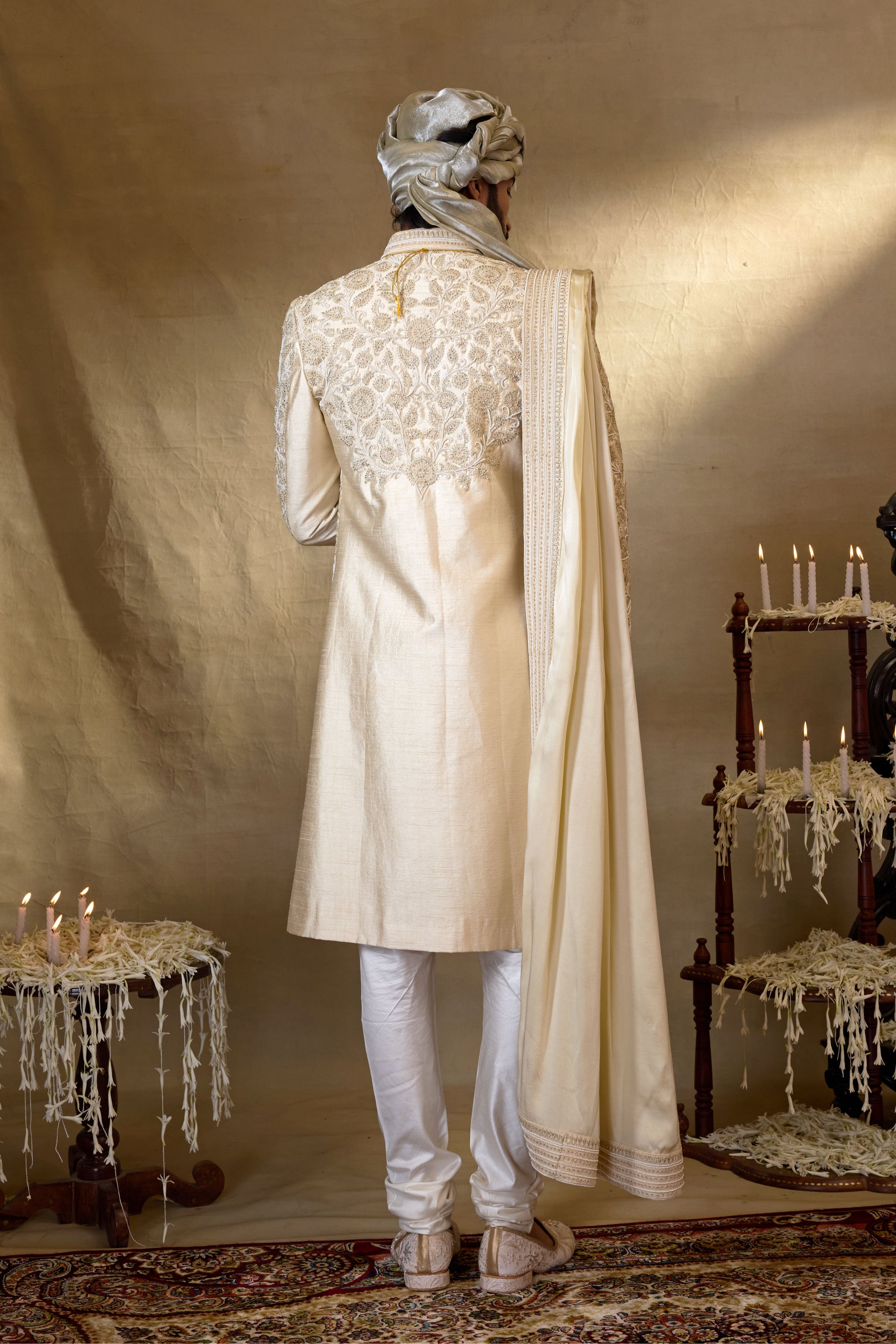 Featuring a Golden Whisper embroidered Sherwani set , it is paired with matching silk kurta , churidar and stole