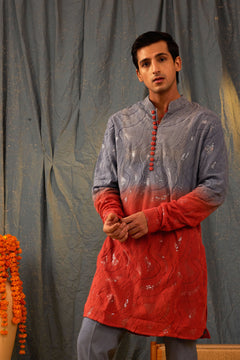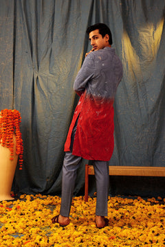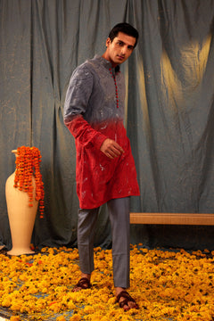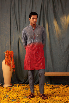 Upgrade your wardrobe with our Ember Fusion Kurta Set. Made with self-embroidered fabric that boasts a sophisticated dual tone of grey and coral, this set is perfect for adding a touch of elegance to your look. Complete your ensemble with the included grey pants for a polished and stylish outfit.