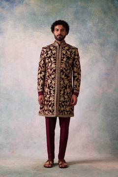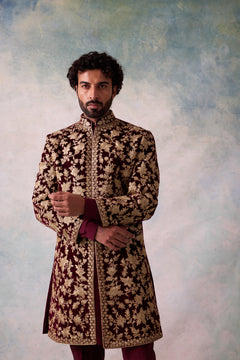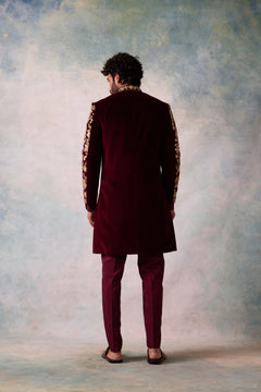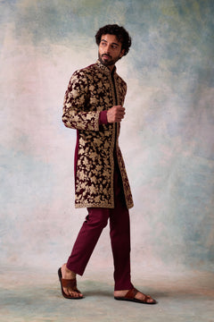 Experience the allure and luxury of our Garnet Glamour Indo Set. Made from maroon velvet, this set features intricate gold aari embroidery, adding a touch of opulence to this traditional kurta set. Elevate your style and stand out from the crowd with this stunning and elegant ensemble.
