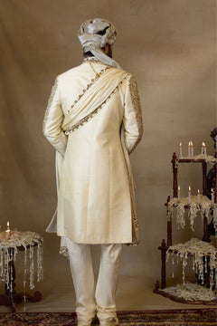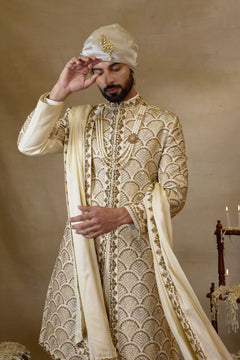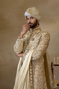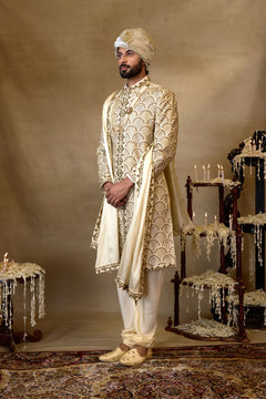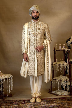 Featuring a Gold silk embroidered Sherwani set , it is paired with matching silk kurta , churidar and stole