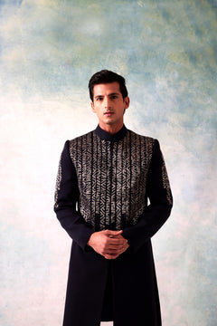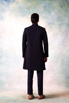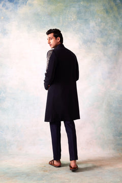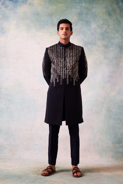 Indulge in luxury with our Iris Eclipse Indo Set. Made with pure silk, this indo set features self silver katdana embroidery. Complete with a kurta and pant, elevate your style with elegance and comfort.