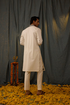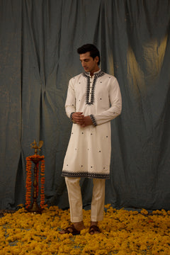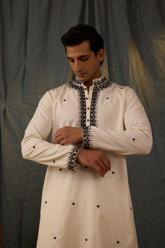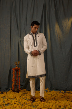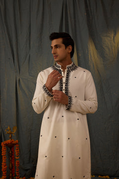 The Ivory Black kurta Set is expertly crafted from silk and features delicate embroidery. This luxurious kurta set exudes elegance and sophistication, making it the perfect choice for any formal occasion. With its high-quality materials and intricate detailing, this set is sure to make you stand out from the crowd.