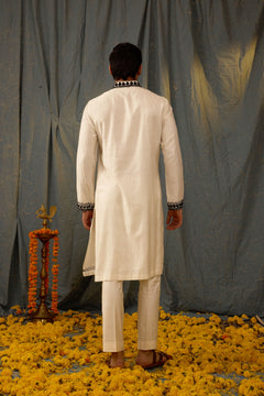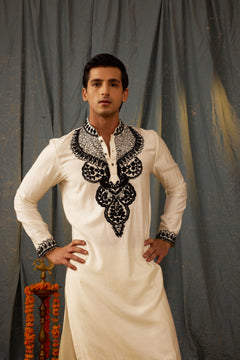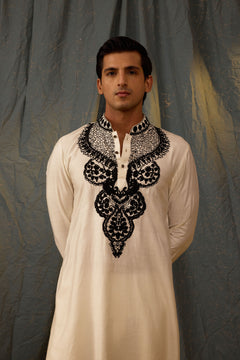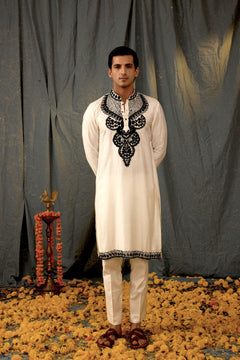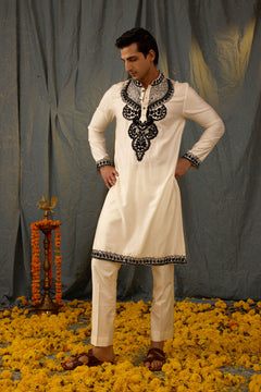 The Ivory Eclipse kurta Set is expertly crafted from silk and features delicate embroidery. This luxurious kurta set exudes elegance and sophistication, making it the perfect choice for any formal occasion. With its high-quality materials and intricate detailing, this set is sure to make you stand out from the crowd.