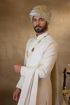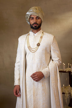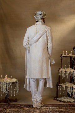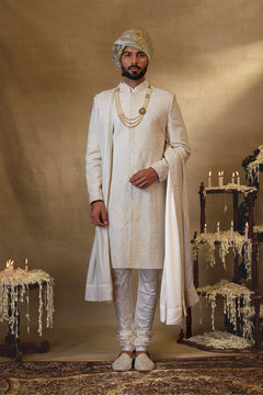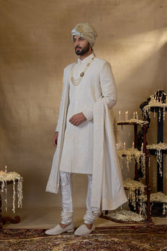 Featuring an Royal Ecru embroidered Sherwani set , it is paired with matching silk kurta , churidar and stole