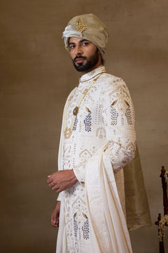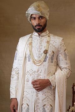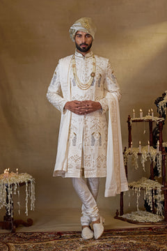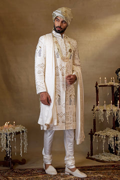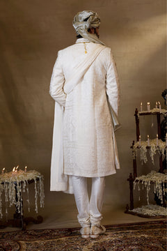 Featuring Gardenia White embroidered Sherwani set , it is paired with matching silk kurta , churidar and stole
