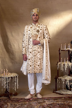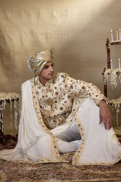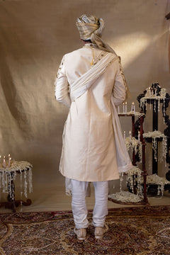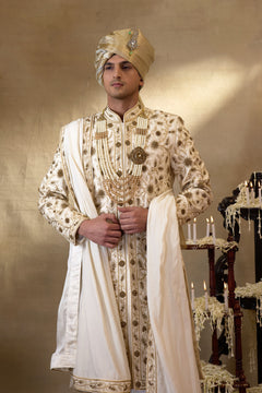 Featuring an Ivory silk embroidered Sherwani set , it is paired with matching silk kurta , churidar and stole