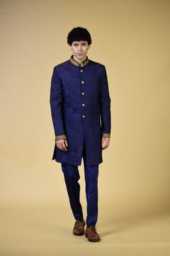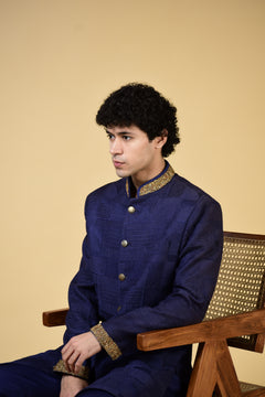 This Navy Blue Gilded Indo Set features a navy blue self indo with dabka gold work on the collar, paired with a silk kurta and pants. Exquisitely crafted, this set exudes sophistication and elegance. Perfect for formal occasions or cultural events, it will make you stand out with its luxurious detailing.