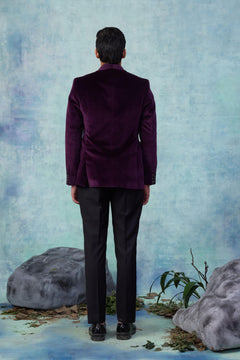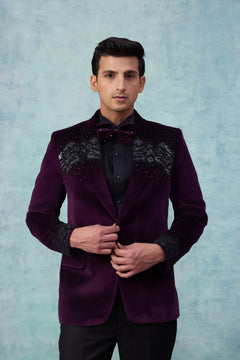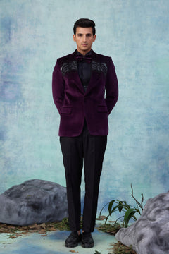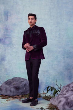 Indulge in luxury with our Opulent Garnet Tuxedo Set. Made in velvet, this Wine tuxedo set features sequin and pearl work embroidery. Complete with a shirt , bow and pant, elevate your style with elegance and comfort.