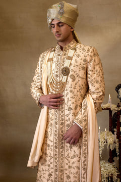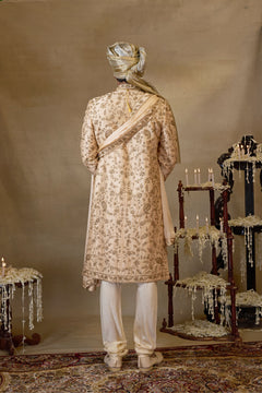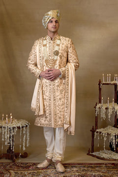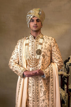 Featuring a Peach Gold silk embroidered Sherwani set , it is paired with matching silk kurta , churidar and stole