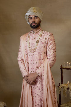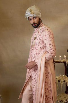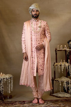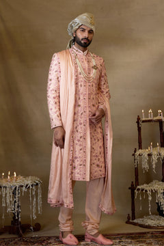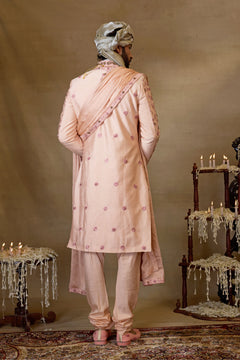 Featuring a The Peach Edit embroidered Sherwani set , it is paired with matching silk kurta , churidar and stole