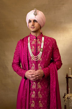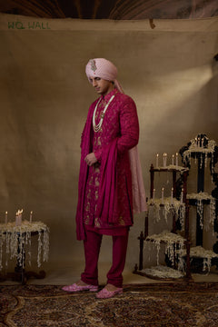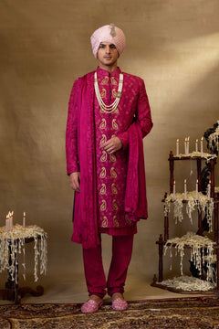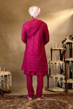 Featuring a Berry silk embroidered Sherwani set , it is paired with matching silk kurta , churidar and stole