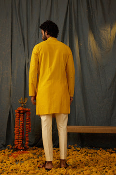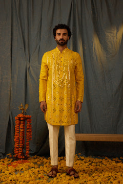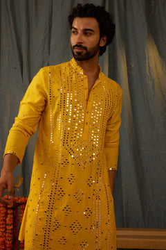 This expertly crafted Kurta Set features a vibrant yellow mirror kurta paired with elegant ivory pants. The striking contrast of colors and intricate mirror detailing make for a versatile and stylish addition to any wardrobe. Perfect for any occasion, this set offers a sophisticated touch to your ensemble.