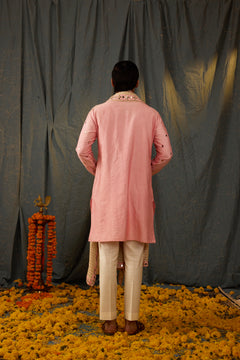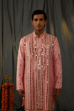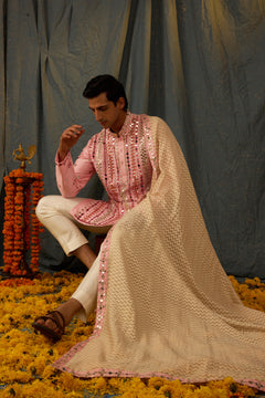 This Reflective Rose Mirror Kurta Set features a stunning mirror kurta, made with pure silk and intricately woven with multiple threads. Complete with a stylish stole and ivory pants, this set is perfect for adding a touch of elegance to any occasion. Elevate your wardrobe with this luxurious and versatile set.