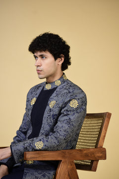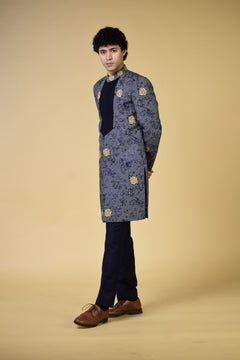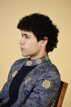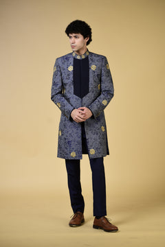 Expertly crafted with navy blue jacquard fabric and adorned with intricate gold embroidery motifs, the Royal Azure Regalia Indo Set exudes regal elegance. The front pleating adds a touch of sophistication to this traditional ensemble. Elevate your wardrobe with this luxurious and timeless piece.