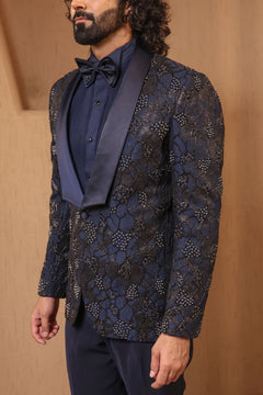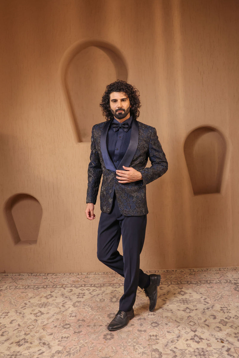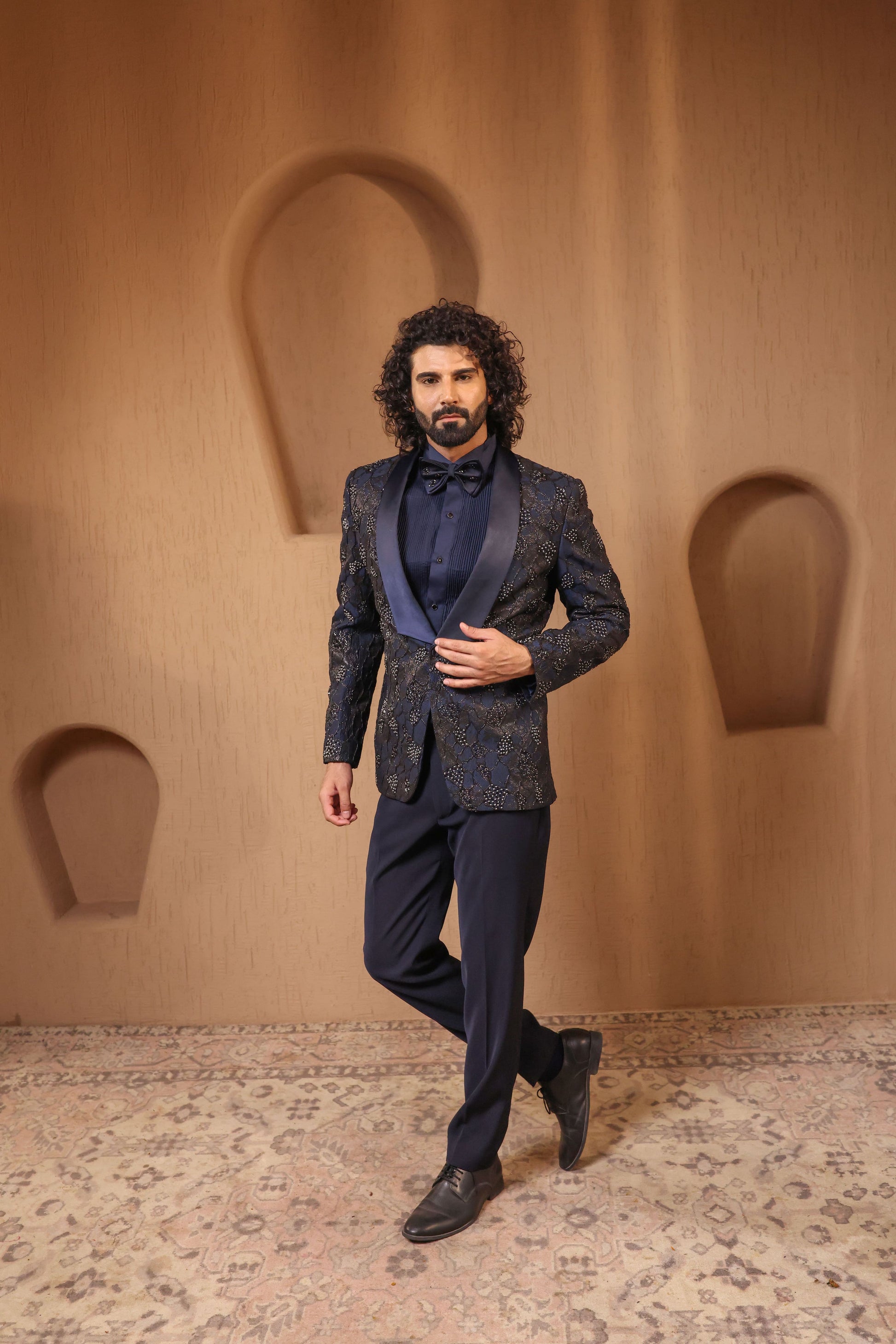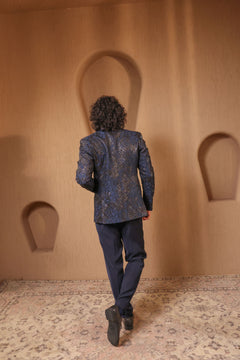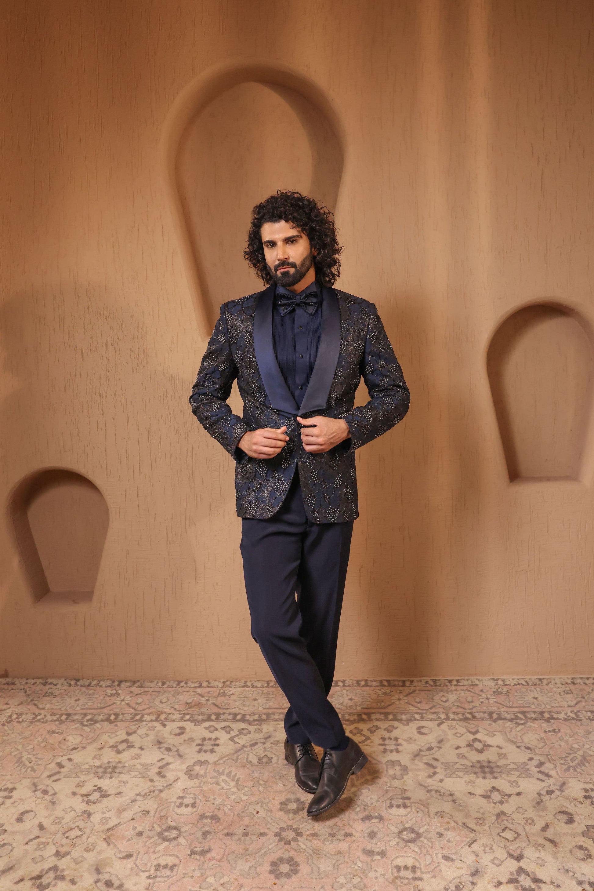 The Royal Blue Jacquard Tuxedo Set is crafted in rich blue jacquard fabric and enhanced with subtle highlighting that adds depth and elegance. The textured weave paired with sharp tailoring creates a sophisticated ensemble, perfect for receptions, formal evenings, and grand celebrations.