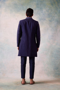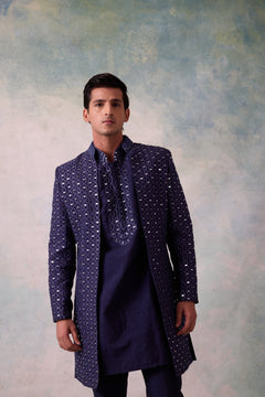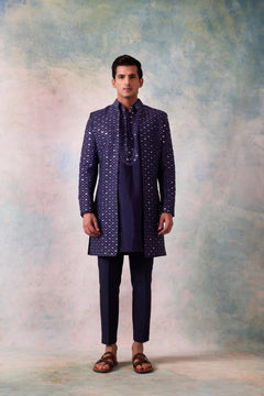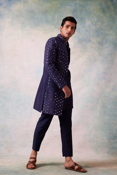 The Royal Reflections Indo Set features a stunning purplish blue open mirror design, adding elegance to any occasion. Crafted with the same color kurta and pant, this set offers a complete and stylish look. Elevate your wardrobe with this beautifully crafted indo set.