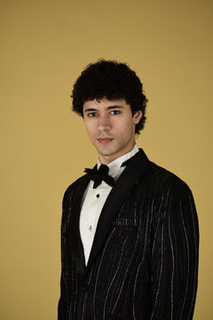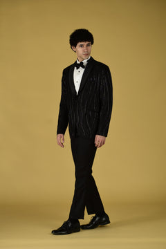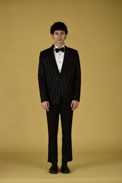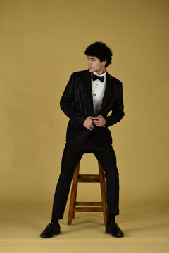 Indulge in luxury with our Shadow Stitch Tuxedo Set. Made in Suiting fabric , this Black tuxedo set features sequin , katdana and pearl work embroidery. Complete with a shirt , bow and pant, elevate your style with elegance and comfort.