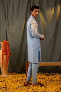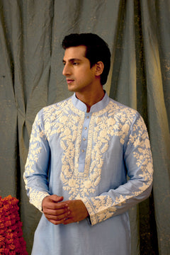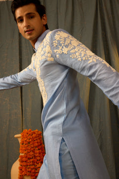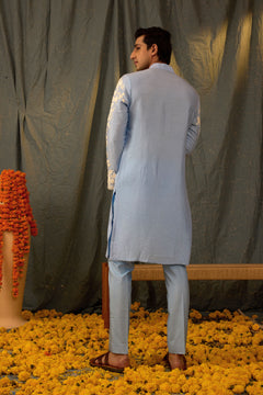 The Serene Sky Blue kurta Set is expertly crafted from silk and features delicate embroidery. This luxurious kurta set exudes elegance and sophistication, making it the perfect choice for any formal occasion. With its high-quality materials and intricate detailing, this set is sure to make you stand out from the crowd.