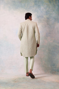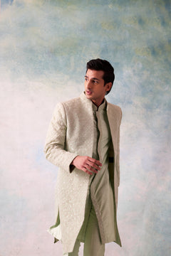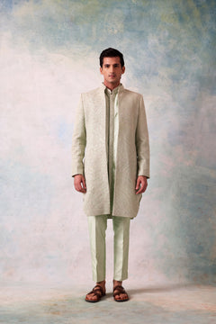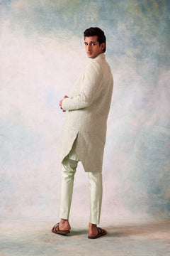 Indulge in luxury with our Mint Edit Indo Set. Made with pure silk, this Mint Green indo set features self work embroidery. Complete with a kurta and pant, elevate your style with elegance and comfort.