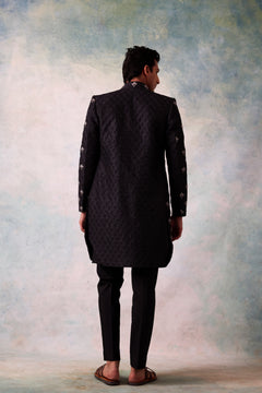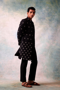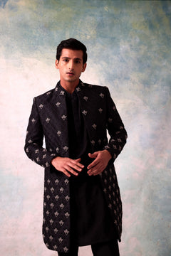 Indulge in luxury with our Twilight Knots Indo Set. Made with pure silk, this front open indo set features self embroidery and sequin touch for a touch of sparkle. Complete with a kurta and pant, elevate your style with elegance and comfort.